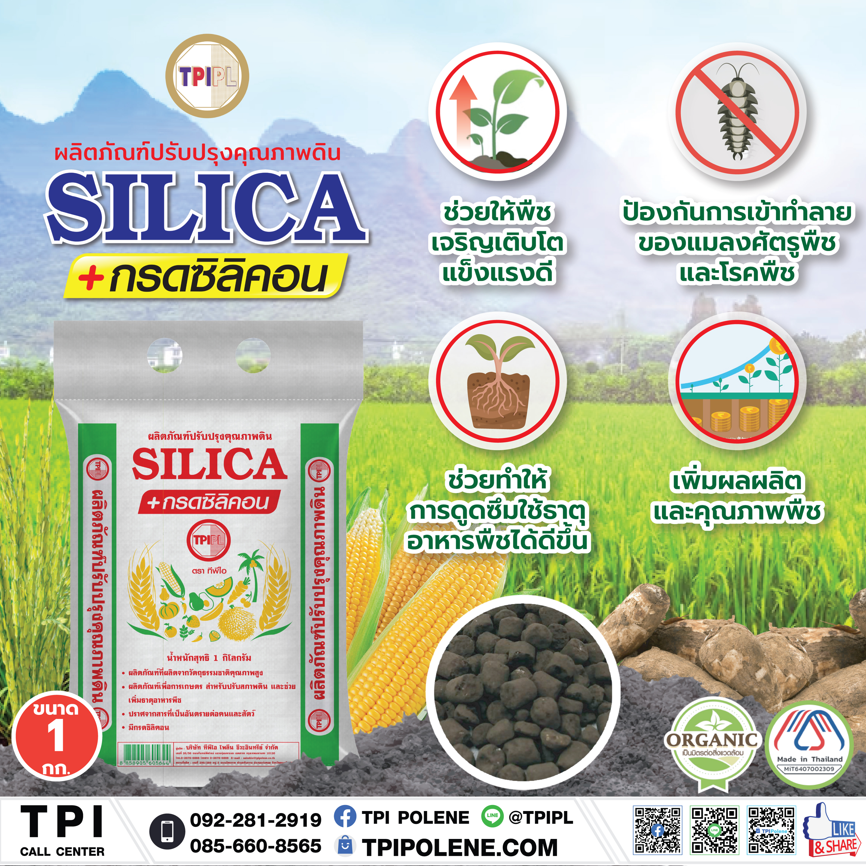 เป็นผลิตภัณฑ์ที่ผลิตจากวัตถุธรรมชาติคุณภาพสูง มีแร่ธาตุซิลิคอนชนิดละลายน้ำได้ ฟื้นฟูแก้ไขดินที่เสือมโทรมช่วยปรับโครงสร้างดินช่วยทำให้ธาตุอาหารเป็นประโยชน์ต่อพืชเพิ่มขึ้น เหมาะสำหรับพืชไร่ ไม้ผล พืชผัก โดยเฉพาะข้าว ทำให้ต้นข้าวแข็งแรง ไม่หักล้มง่าย ลำต้นตั้งตรง รับแสงแดดได้ดี เพิ่มปริมาณการแตกกอ รวงข้าวเพิ่มขึ้น ปริมาณซิลิคอนสะสมเข้มข้นทำให้ลดการเข้าทำลายของหนอนกอ เพลี้ยจั๊กจั่น โรคราต่างๆ ได้